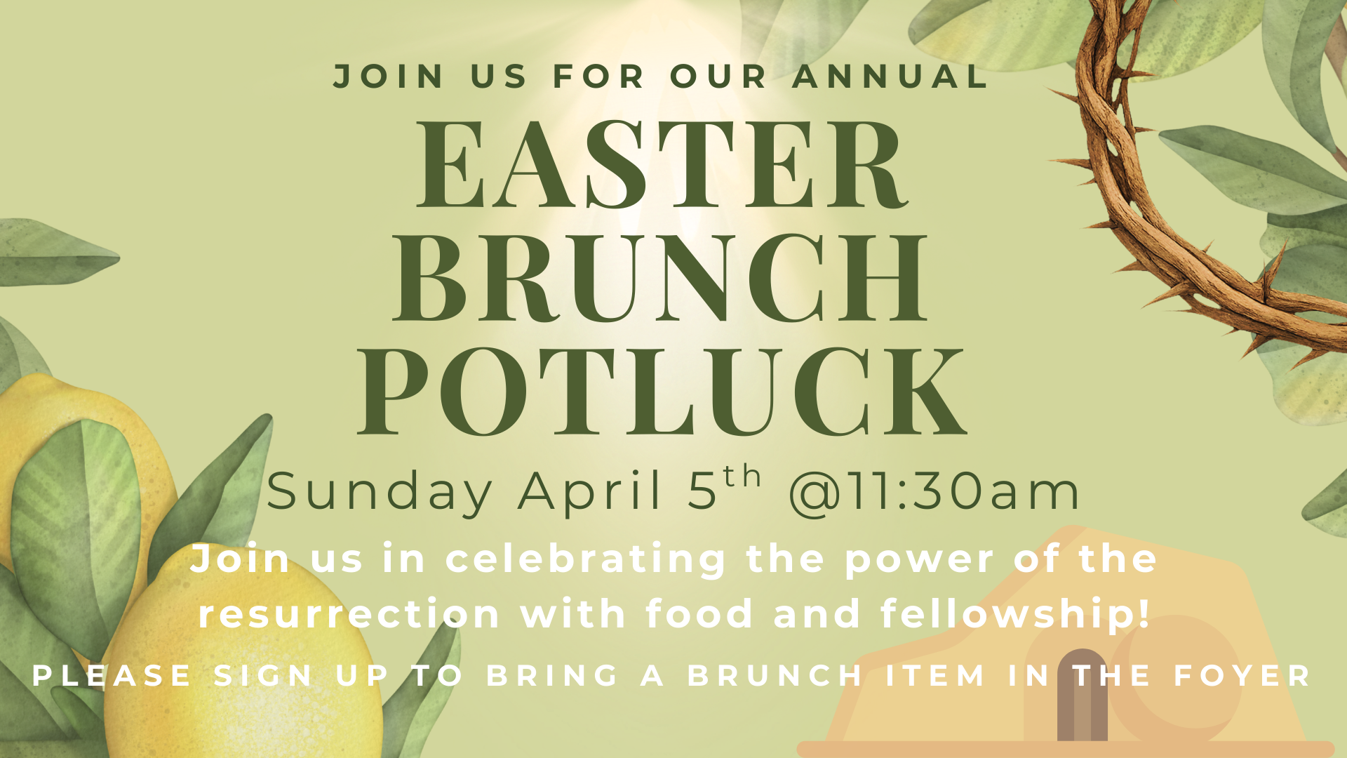 Celebrate the glorious resurrection of our Lord and Savior, Jesus Christ, with fellowship and food! Join us on Sunday, April 5th at 11:30 AM for a joyous Easter brunch potluck.